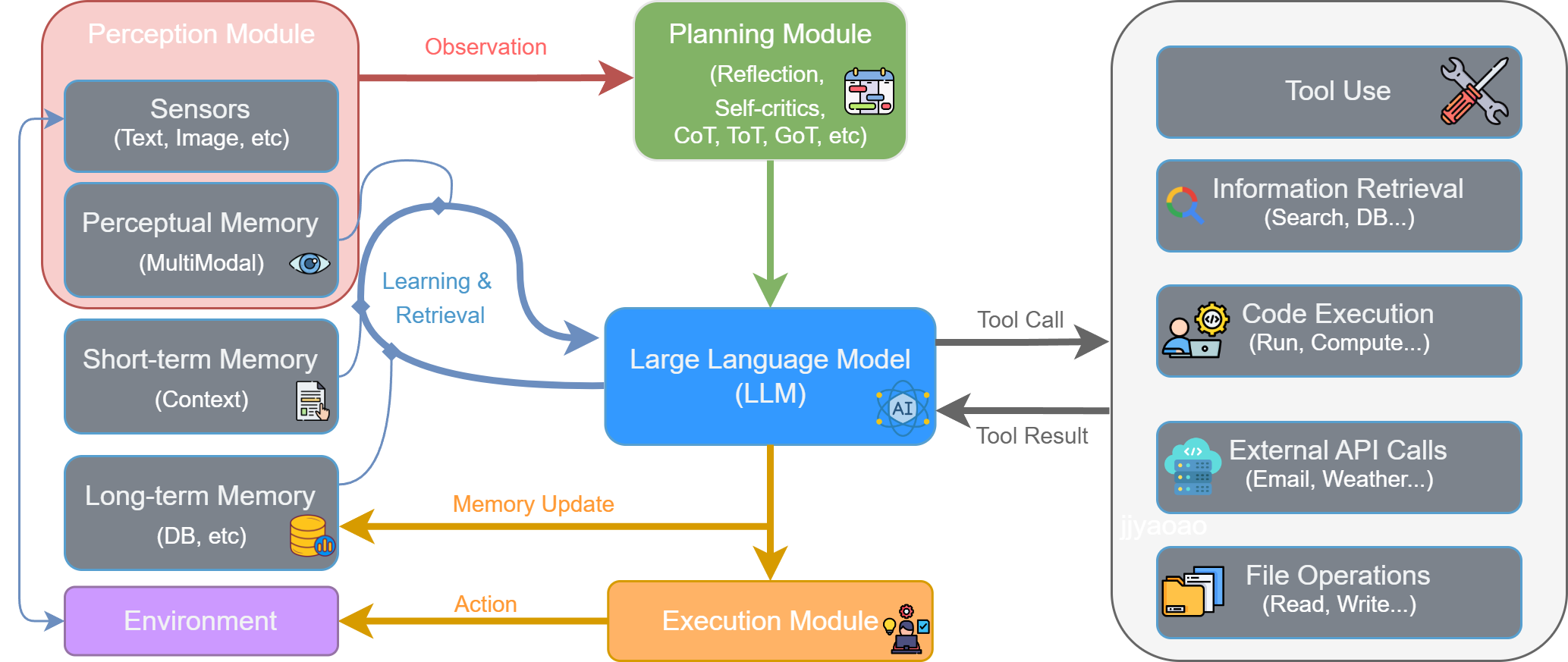 - 推理与决策: 假设 API 返回结果为“阴天”。Agent 的 LLM 大脑会基于这个信息进行推理:“需要搜索适合阴天游玩的邵阳景点”。接着,它会根据这个判断,在它的知识库中或再调用其它的搜索引擎工具,筛选出符合要求的景点,如瑶寨、白水洞等。