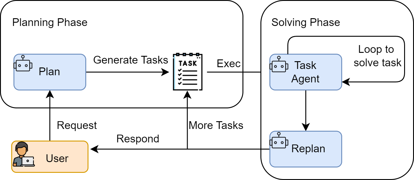 - 执行阶段 (Solving Phase): 在获得完整的计划后,智能体进入执行阶段。它会严格按照计划中的步骤,逐一执行。每一步的执行都可能是一次独立的 LLM 调用,或者是对上一步结果的加工处理,直到计划中的所有步骤都完成,最终得出答案。
