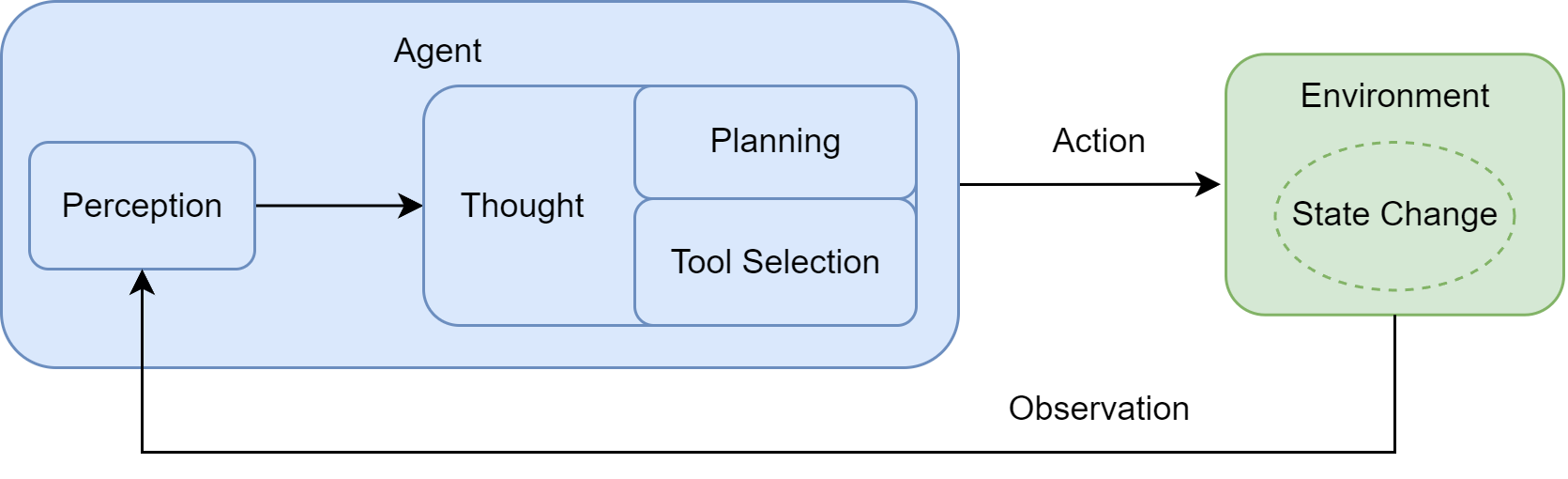 在工程实践中,为了让 LLM 能够有效驱动这个循环,我们需要一套明确的交互协议 (Interaction Protocol)来规范其与环境之间的信息交换。 在许多现代智能体框架中,这一协议体现在对智能体每一次输出的结构化定义上。智能体的输出不再是单一的自然语言回复,而是一段遵循特定格式的文本,其中明确地展示了其内部的推理过程与最终决策。 由于该循环结构通常由 Thought、Action、Observation 三个部分构成,因此被称为Thought-Action-Observation交互范式。通过它,LLM智能体得以将内部的语言推理能力,与外部环境的真实信息和工具操作能力有效地结合起来。